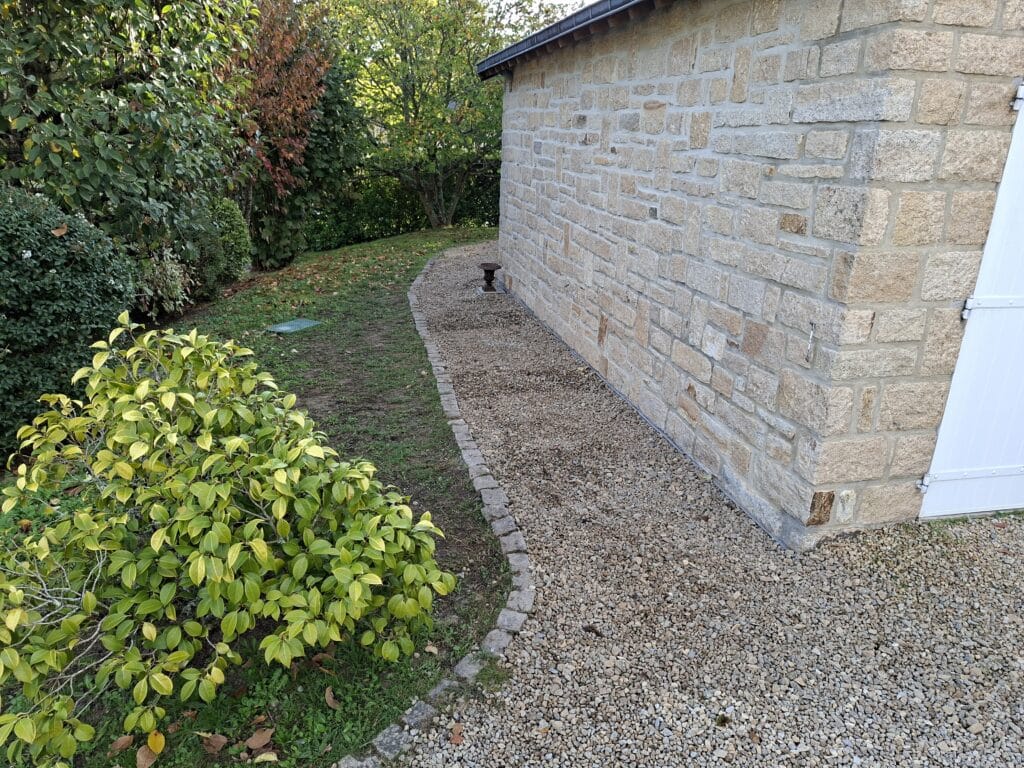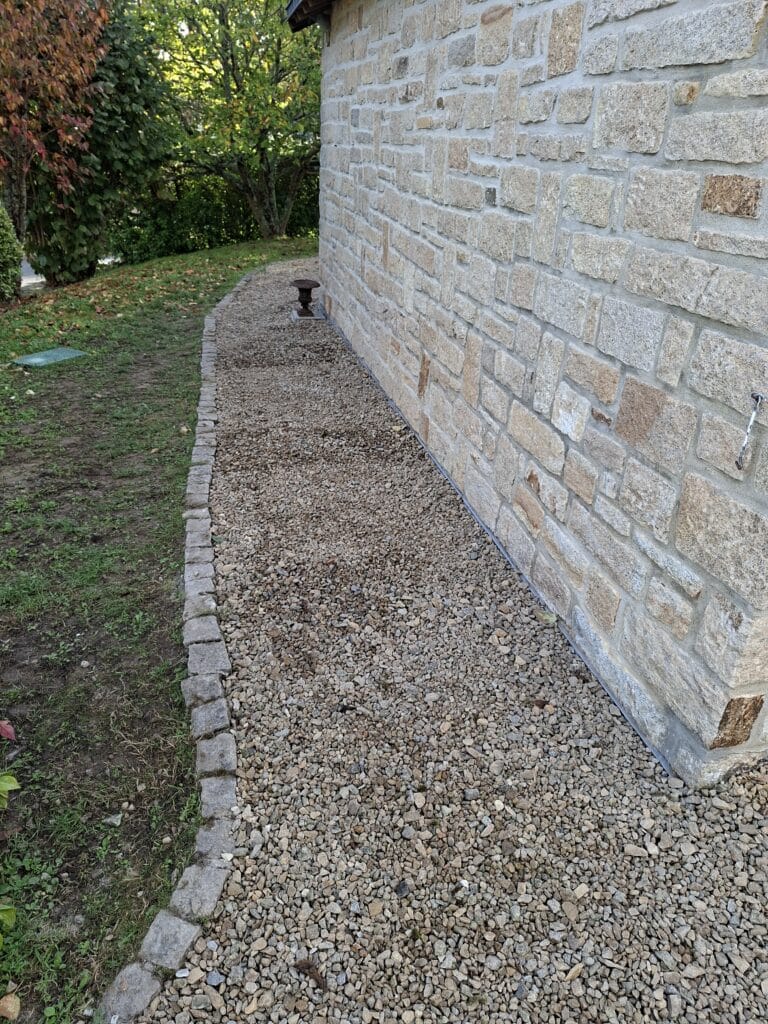 Pour refermer, pas question de remettre de la terre qui retient l’humidité. Nous avons opté pour un remblaiement drainant fini avec un gravier fin sélectionné chez DRM Matériaux. C’est propre, ça draine bien, et ça sublime le mur en pierre !